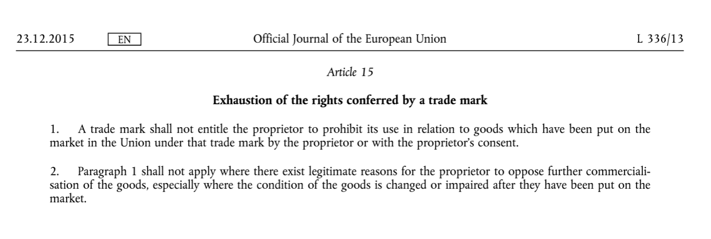 The rule can now be found in art. 15 of TM Directive 2015/2436: “A trademark shall not entitle the proprietor to prohibit its use in relation to goods which have been put on the market in the Union under that trademark by the proprietor or with the proprietor’s consent”. It is now incorporated in the Italian law at sec. 5 of the Industrial Property Code.